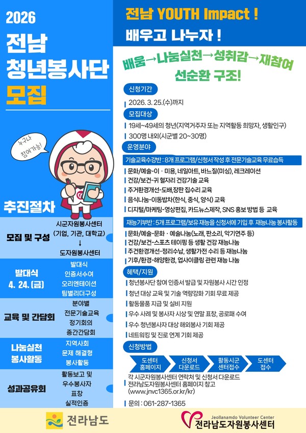 모집 대상은 봉사활동에 관심이 있는 19세~ 49세 청년으로, 지역 사회에 긍정적인 변화를 만들어가고 싶은 청년이라면 누구나 참여할 수 있다.