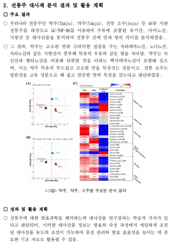 연구진은 전통주 제조 중 생성되는 대사산물 정보를 바탕으로 각 주류의 고유한 풍미와 품질을 밝히고자 한국 농식품 성분 활용 기반 고도화 공동연구사업을 통해 전통주 48개를 수집해 성분을 비교했으며, 그 결과 33종의 유의미한 대사체를 식별했다.