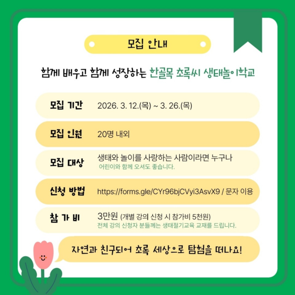 모집기간은 오는 26일까지이며, 생태와 놀이에 관심 있는 누구나 신청 가능하다. 모집인원은 20명 내외로, 참가비는 3만원이며 개별 강의 신청도 가능하다.